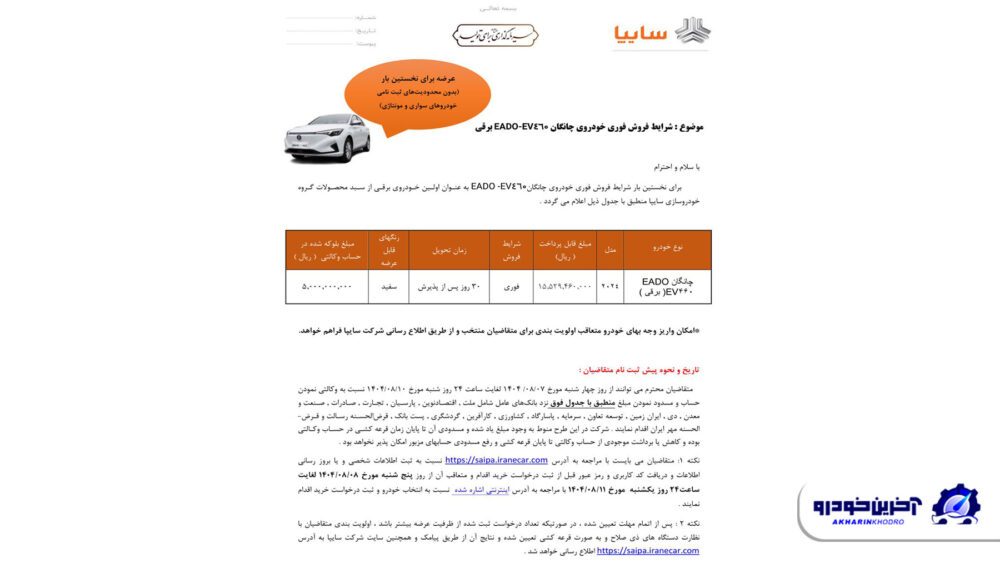 شرکت سایپا نخستین شرایط فروش فوری خودروی چانگان EADO-EV460 برقی را اعلام کرد.