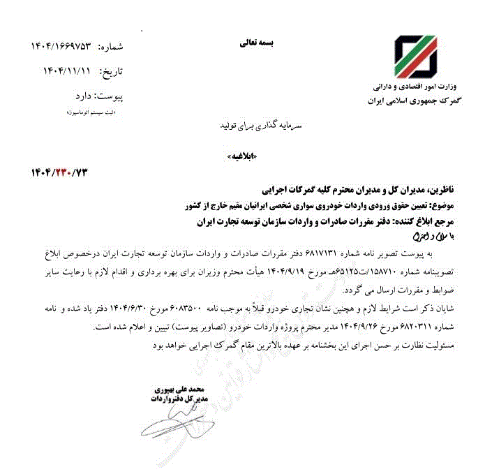 ابلاغیه گمرک در خصوص تعیین حقوق ورودی واردات خودروی سواری شخصی ایرانیان مقیم خارج از کشور ابلاغ شد.